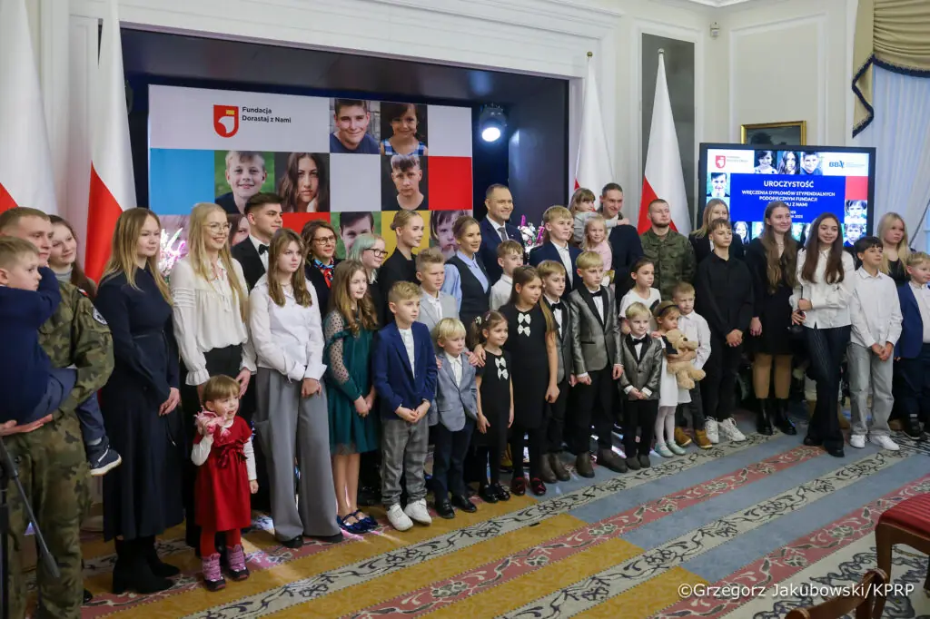 Dzisiaj w Pałacu Prezydenckim Prezydent RP Karol Nawrocki wraz z Małżonką wręczyli dyplomy stypendialne dzieciom poległych lub rannych żołnierzy, funkcjonariuszy i pracowników służb publicznych – podopiecznym Fundacji Dorastaj z Nami.