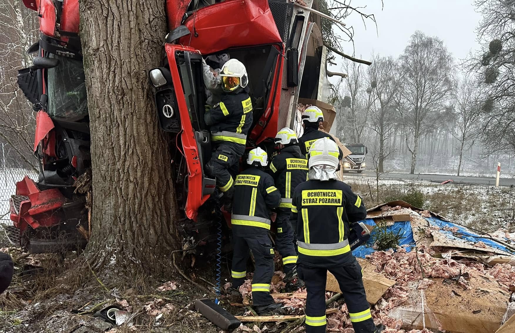 Na 276 kilometrze drogi krajowej nr 10 kierujący ciągnikiem siodłowym z nieznanych przyczyn zjechał z drogi i czołowo uderzył w drzewo.