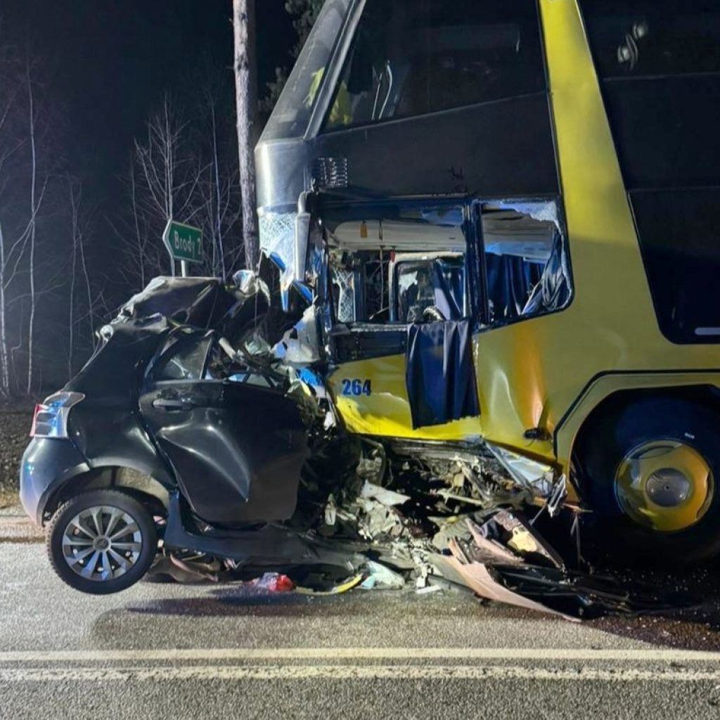 Kierujący samochodem osobowym z nieznanych przyczyn zjechał na przeciwległy pas ruchu i czołowo zderzył się z jadącym z naprzeciwka autokarem. W wyniku zderzenia kierujący osobówką zginął na miejscu, a kierowca autokaru trafił do szpitala.