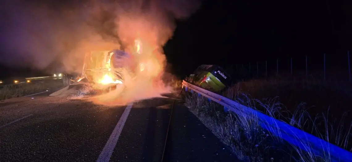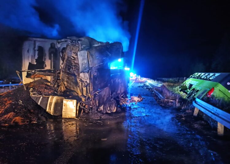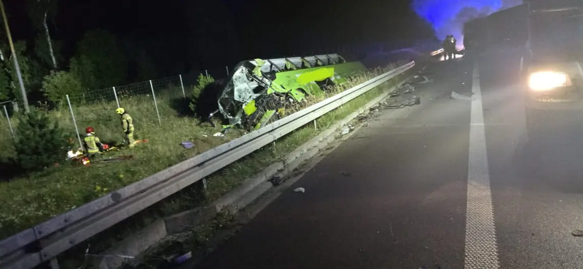 Ze wstępnych ustaleń wynika, że w wyniku wystrzału opony w ciężarówce kierujący stracił panowanie nad pojazdem i uderzył w jadący z naprzeciwka autokar. Po zderzeniu w ciężarówce wybuchł pożar, a autokar wypadł z drogi.