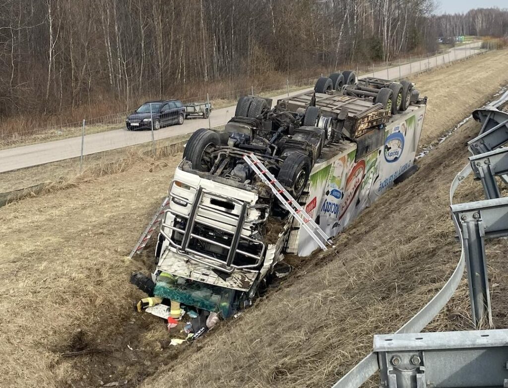 W wyniku zderzenia kierowca stracił panowanie nad zestawem, przebił barierę energochłonną i znalazł się w przydrożnym rowie, gdzie dachował.