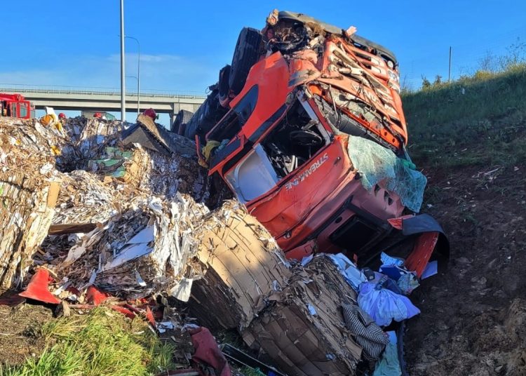 Jak informuje Gazeta Pomorska, prawdopodobnie z powodu pękniętej opony kierowca ciężarówki stracił panowanie nad pojazdem, zjechał z drogi i dachował.