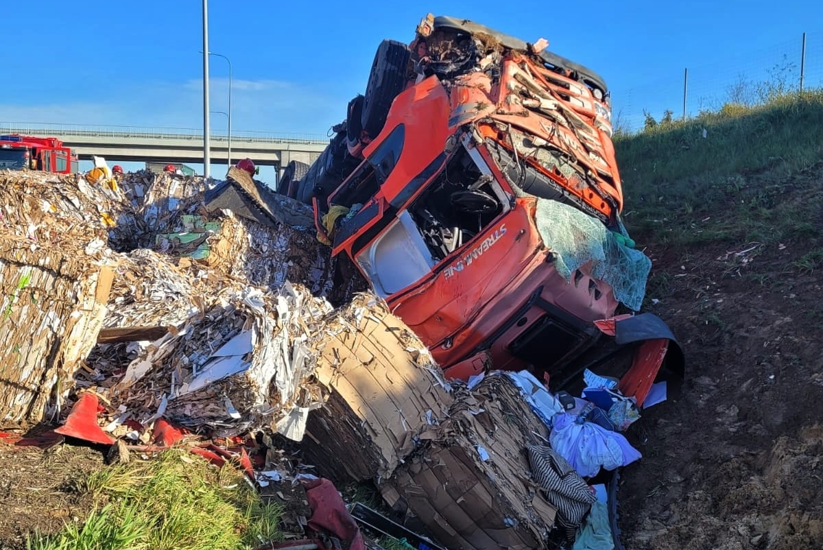 Jak informuje Gazeta Pomorska, prawdopodobnie z powodu pękniętej opony kierowca ciężarówki stracił panowanie nad pojazdem, zjechał z drogi i dachował.