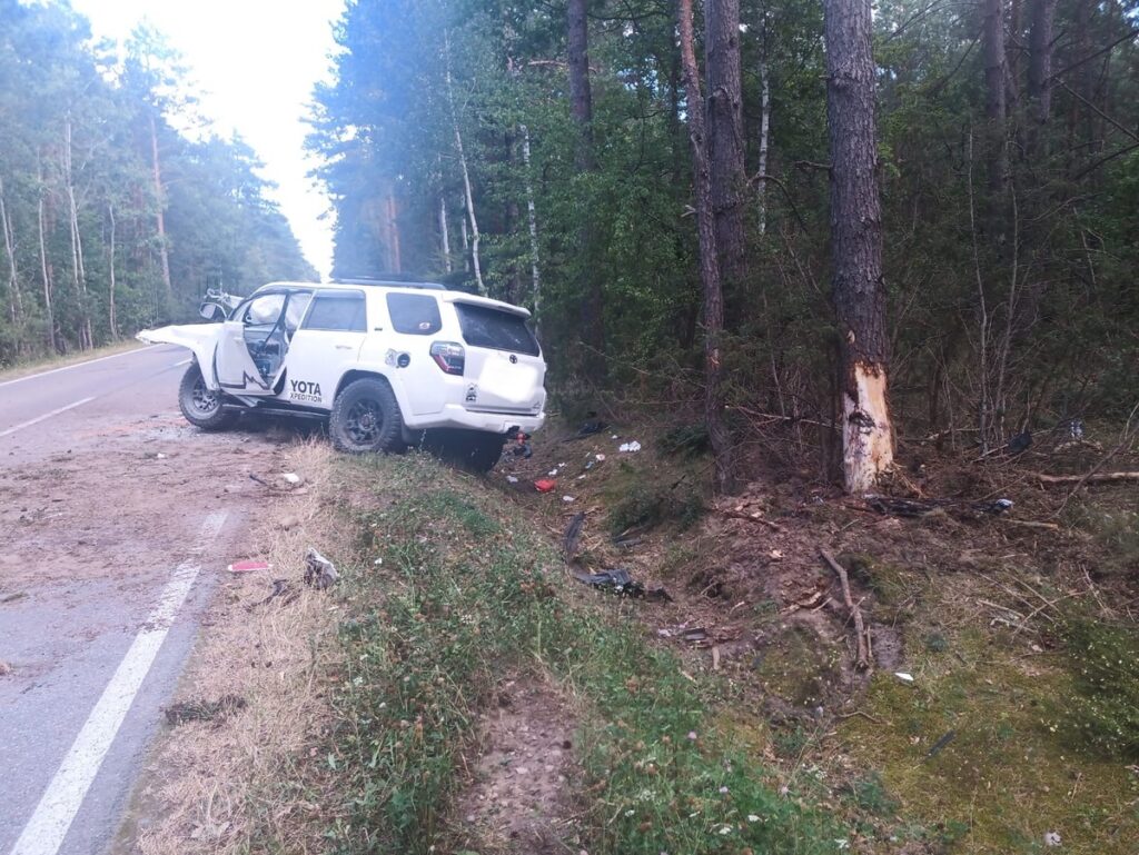 Kierujący pojazdem marki Toyota Auris w trakcie skręcania w lewo, zderzył się z pojazdem marki Toyota 4 Runner, w którym znajdowały się dwie osoby. Pojazd ten w wyniku zdarzenia zjechał z jezdni uderzając w drzewo, gdzie doszło do zapłonu komory silnikowej – informuje policja.