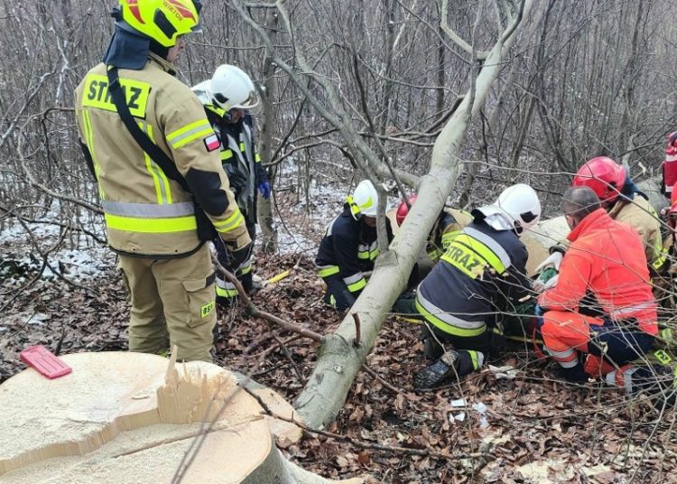 Jak informują służby, podczas prowadzonej wycinki drzewo przygniotło nogi pilarza. Na miejsce zadysponowano cztery zastępy straży pożarnej i ZRM.