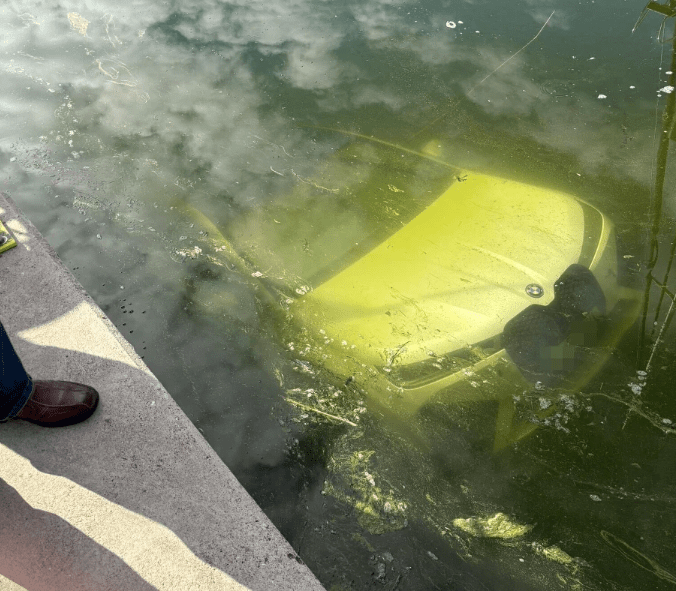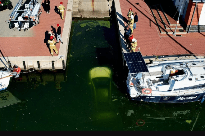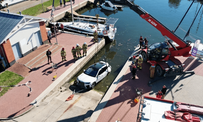 Elektryczny samochód osobowy znajdował się na rampie slipowej i w pewnym momencie stoczył się do wody. W pojeździe nikogo nie było.