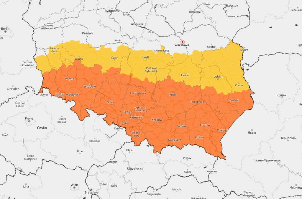 Ostrzeżenia drugiego stopnia wydano dla województw: dolnośląskiego, opolskiego, śląskiego, małopolskiego, świętokrzyskiego i podkarpackiego oraz południowych powiatów województw: lubelskiego, łódzkiego i wielkopolskiego.