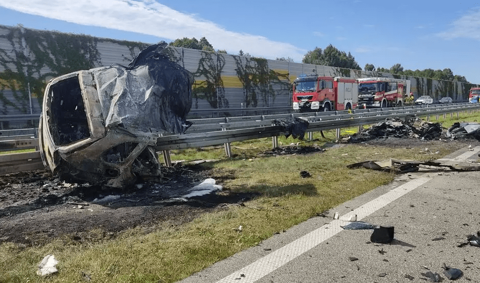 Siła zderzenia była tak duża, że osobówka została rozerwana na części i wybuchł pożar, który objął rozrzucone na drodze elementy pojazdu. Mężczyzna nie miał szans, zginął na miejscu.