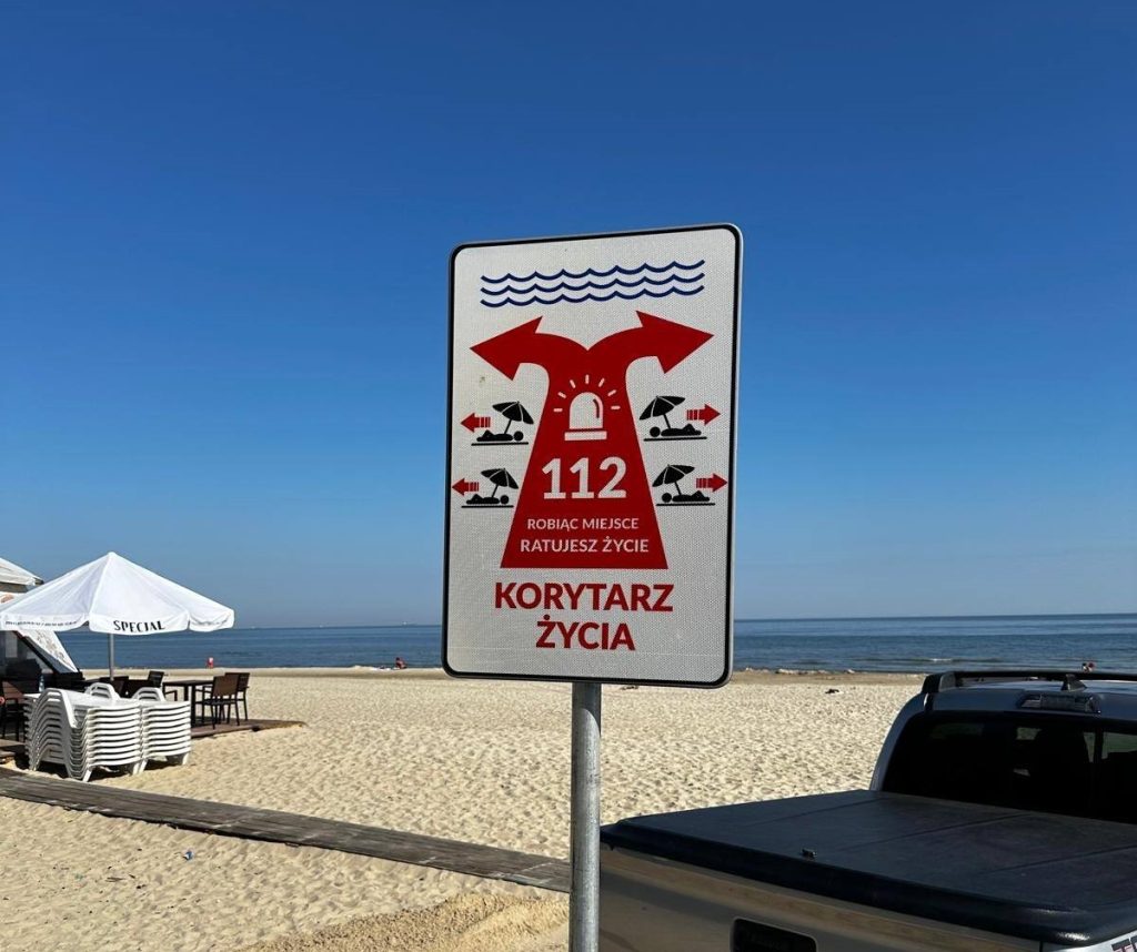 Strażacy z jednostki OSP Jantar w ramach własnej inicjatywy postawili na plaży znak ‘korytarz życia’.