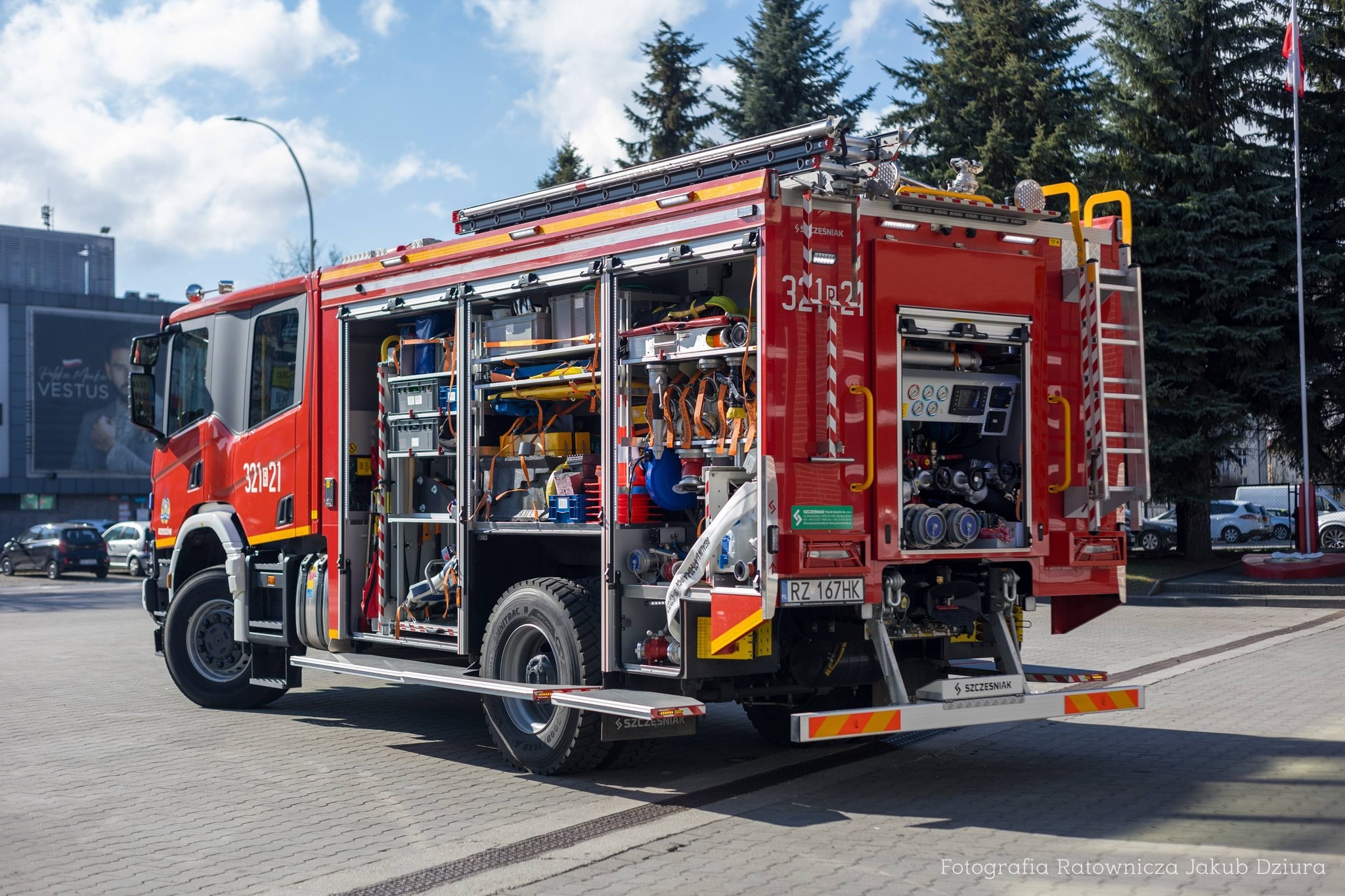 Do tego sprzęt, w tym akumulatorowy zestaw narzędzi hydraulicznych, kamera termowizyjna, sprzęt ratownictwa wysokościowego, zestaw oświetleniowy, motopompa pływająca, agregat prądotwórczy, sprzęt łączności, sprzęt burzący, drabiny, armatura wodno-pianowa, poduszki wysokociśnieniowe, sprzęt do stabilizacji, zestaw do otwierania drzwi, aparaty OUO, pilarki, zestaw ratownictwa medycznego itp.