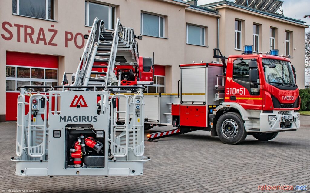 Każdy samochód musi być wyposażony w drabinę mechaniczną o wysokości ratowniczej minimum 40 metrów z ostatnim przęsłem łamanym i koszem ratowniczym o udźwigu minimum 400 kilogramów. Wykonawca musi zapewnić miejsce do przewozu sprzętu zgodnego ze standardem wyposażenia dla samochodu specjalnego z drabiną.