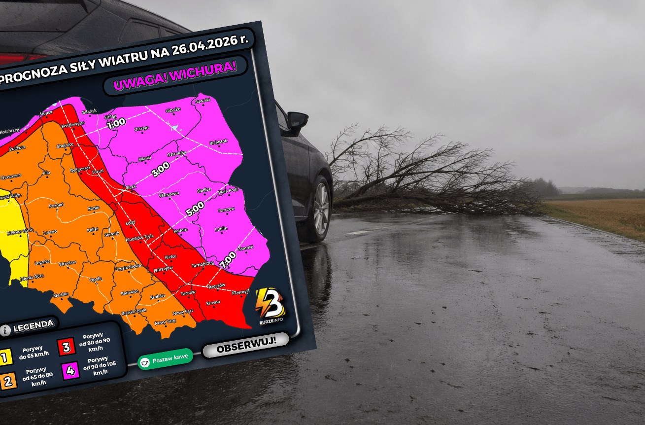Tuż po godzinie pierwszej strefa frontu chłodnego może znajdować się już na wysokości Elbląga. Między 3 a 5 front dotrze na wysokość Warszawy, a po 7 dynamiczna aura pojawi się tuż przed Zamościem. Bezpośrednio w obrębie frontu chłodnego spodziewamy się przeważnie wiatru do 80-90 km/h. Natomiast lokalnie porywy mogą osiągnąć nawet 100 km/h. Takie wartości mogą powodować już znaczne szkody min. w drzewostanie, ale i zrywać fragmenty dachów z budynków. Właściwie całą niedzielę na wschód od Warszawy mogą rozwijać się liczne komórki burzowe z mieszanymi opadami, w których środowisku wiatr może wiać nawet do 100 km/h. Szczególnie dynamiczna aura będzie dotyczyć mieszkańców województwa podlaskiego i lubelskiego – informuje portal burzeinfo.
