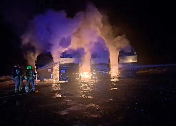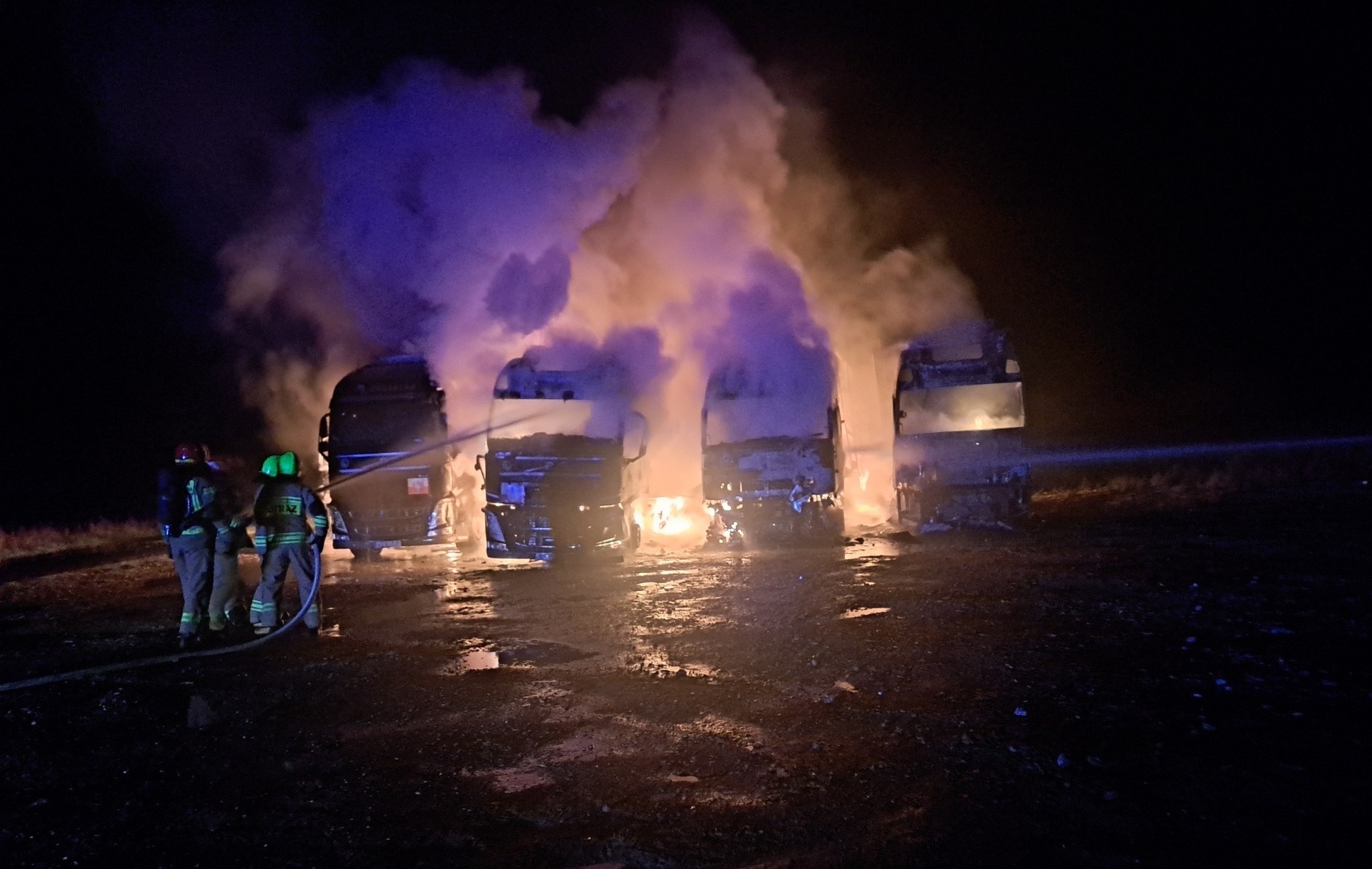 Zgłoszenie o zdarzeniu wpłynęło do straży pożarnej chwilę przed godziną trzecią w nocy. W miejscowości Talczyn płonęło pięć ciągników siodłowych i naczep. Zestawy znajdowały się blisko siebie co doprowadziło do szybkiego rozprzestrzenienia się ognia.