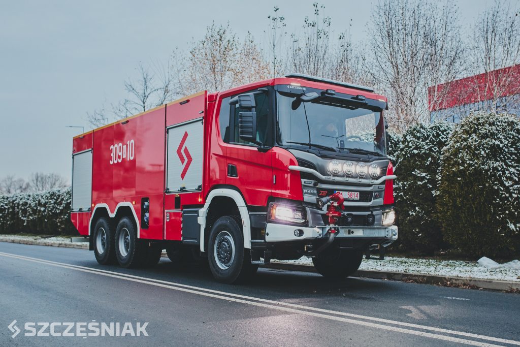 Nowy nabytek ochotników to ciężki samochód ratowniczo – gaśniczy Scania P450 6×6 z zabudową firmy Szczęśniak Pojazdy Specjalne.