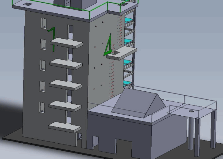 Pierwszy trenażer to 15-metrowa wielozadaniowa wieża z wewnętrzną i zewnętrzną klatką schodową, studnią wewnętrzną i stalowym dachem, ponadto na jednej ze ścian znajdą się chwyty wspinaczkowe. Do wieży będzie przylegał parterowy budynek pełniący rolę magazynu na sprzęt i salki dydaktycznej.