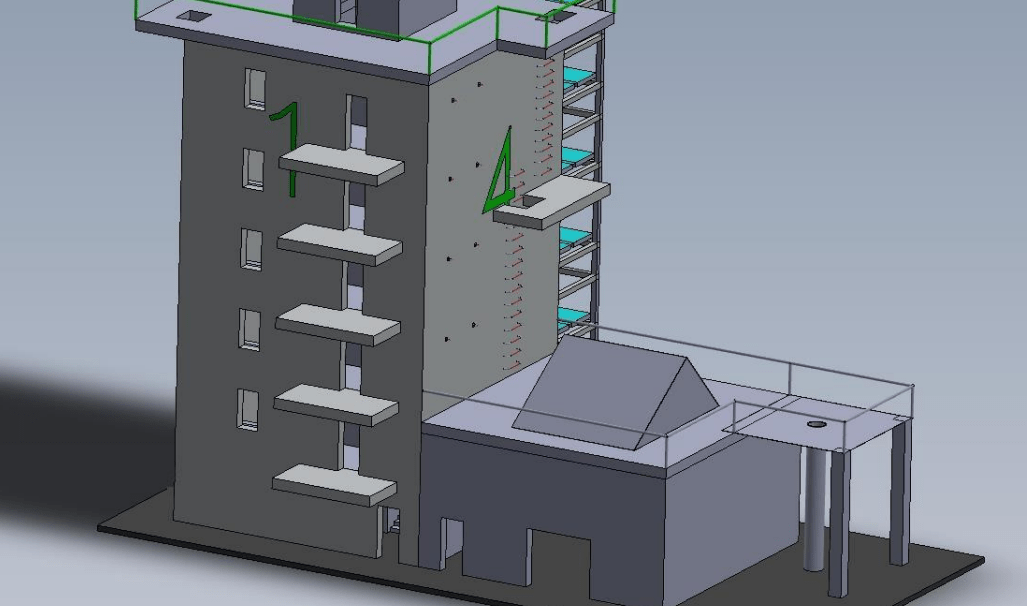 Pierwszy trenażer to 15-metrowa wielozadaniowa wieża z wewnętrzną i zewnętrzną klatką schodową, studnią wewnętrzną i stalowym dachem, ponadto na jednej ze ścian znajdą się chwyty wspinaczkowe. Do wieży będzie przylegał parterowy budynek pełniący rolę magazynu na sprzęt i salki dydaktycznej.