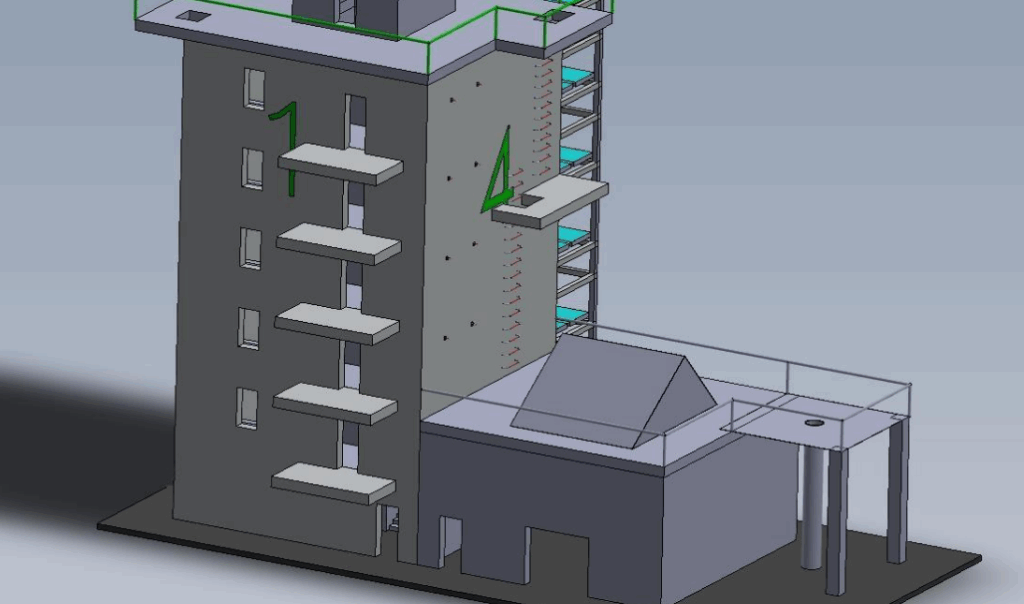 Pierwszy trenażer to 15-metrowa wielozadaniowa wieża z wewnętrzną i zewnętrzną klatką schodową, studnią wewnętrzną i stalowym dachem, ponadto na jednej ze ścian znajdą się chwyty wspinaczkowe. Do wieży będzie przylegał parterowy budynek pełniący rolę magazynu na sprzęt i salki dydaktycznej.