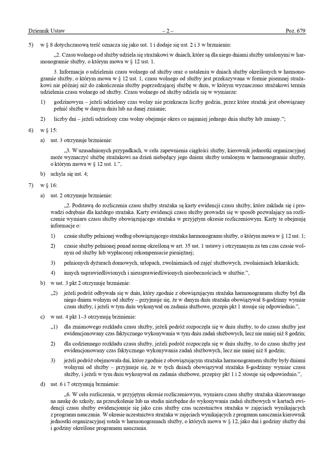 Wśród wprowadzonych zmian jest między innymi doprecyzowanie godzin służby w porze nocnej, obowiązek informowania strażaka o udzieleniu lub odmowie udzielenia zgody, stosownie do wniosku strażaka, innych godzin rozpoczęcia i zakończenia w danym dniu służby, dostosowania okoliczności przedłużenia czasu służby strażaka ze względu na potrzeby służby, określenie sposobu udzielania czasu do wolnego od służby czy unormowanie czasu wolnego od służby po podróży służbowej.