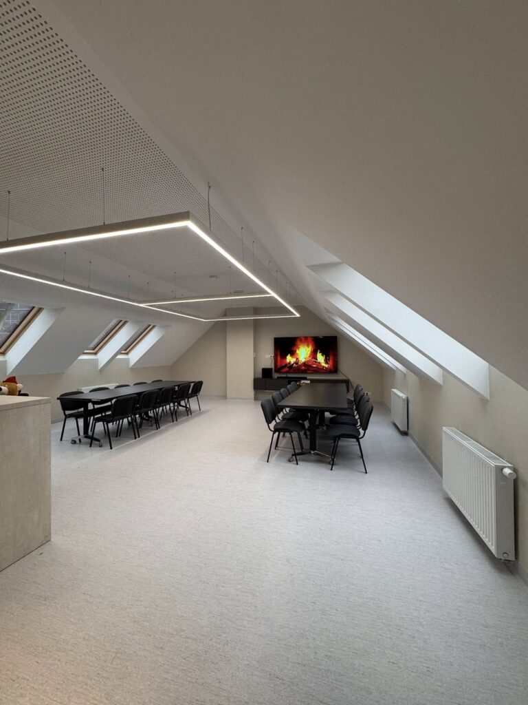 W obiekcie o powierzchni 200 metrów kwadratowych znajdują się dwa garaże, szatnie, pomieszczenia sanitarne, jadalnia z aneksem kuchennym, magazyn na sprzęt i wielofunkcyjna sala konferencyjna.