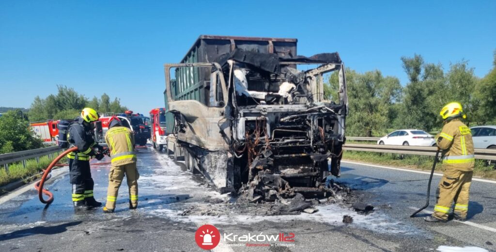 Pożar pojawił się w kabinie pojazdu, w efekcie czego cała uległa ona całkowitemu spaleniu. Kierowca nie odniósł obrażeń, ewakuował się przed przybyciem jednostek ochrony przeciwpożarowej. Pożar ugaszono za pomocą podania jednego prądu gaśniczego w natarciu na płonący pojazd oraz linią szybkiego natarcia. Na jezdni rozstawiono także rękawy sorpcyjne celem neutralizacji substancji płynnych – informuje Krakow112.pl