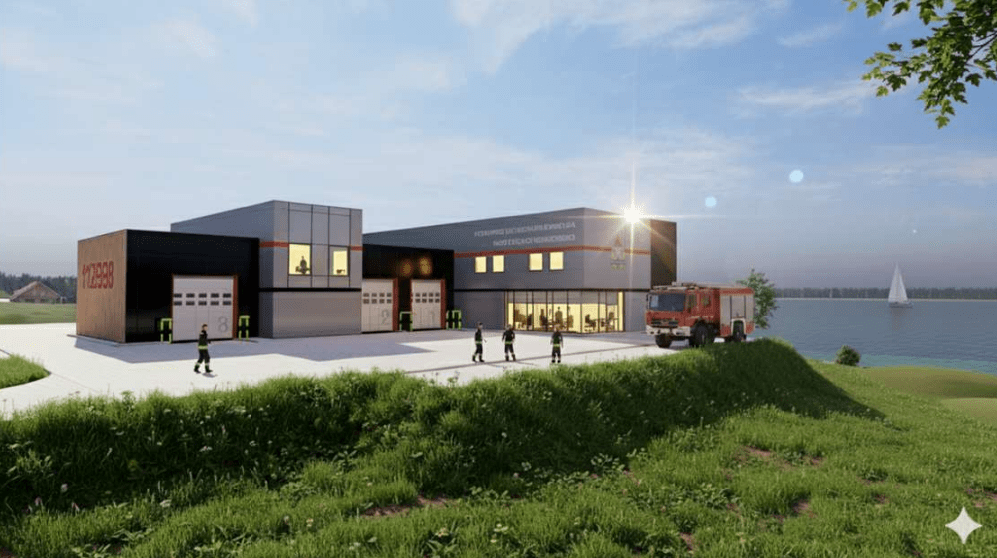 Na parterze znajdzie się garaż na cztery pojazdy, pomieszczenia do dezynfekcji pojazdów i sprzętu, stacja ODO, magazyny, pokój wypoczynku, sala sztabowa, szatnia, toalety, pralnia i pomieszczenie socjalne. Pierwsze piętro to szereg pomieszczeń służbowych i wypoczynku wraz z łazienkami.