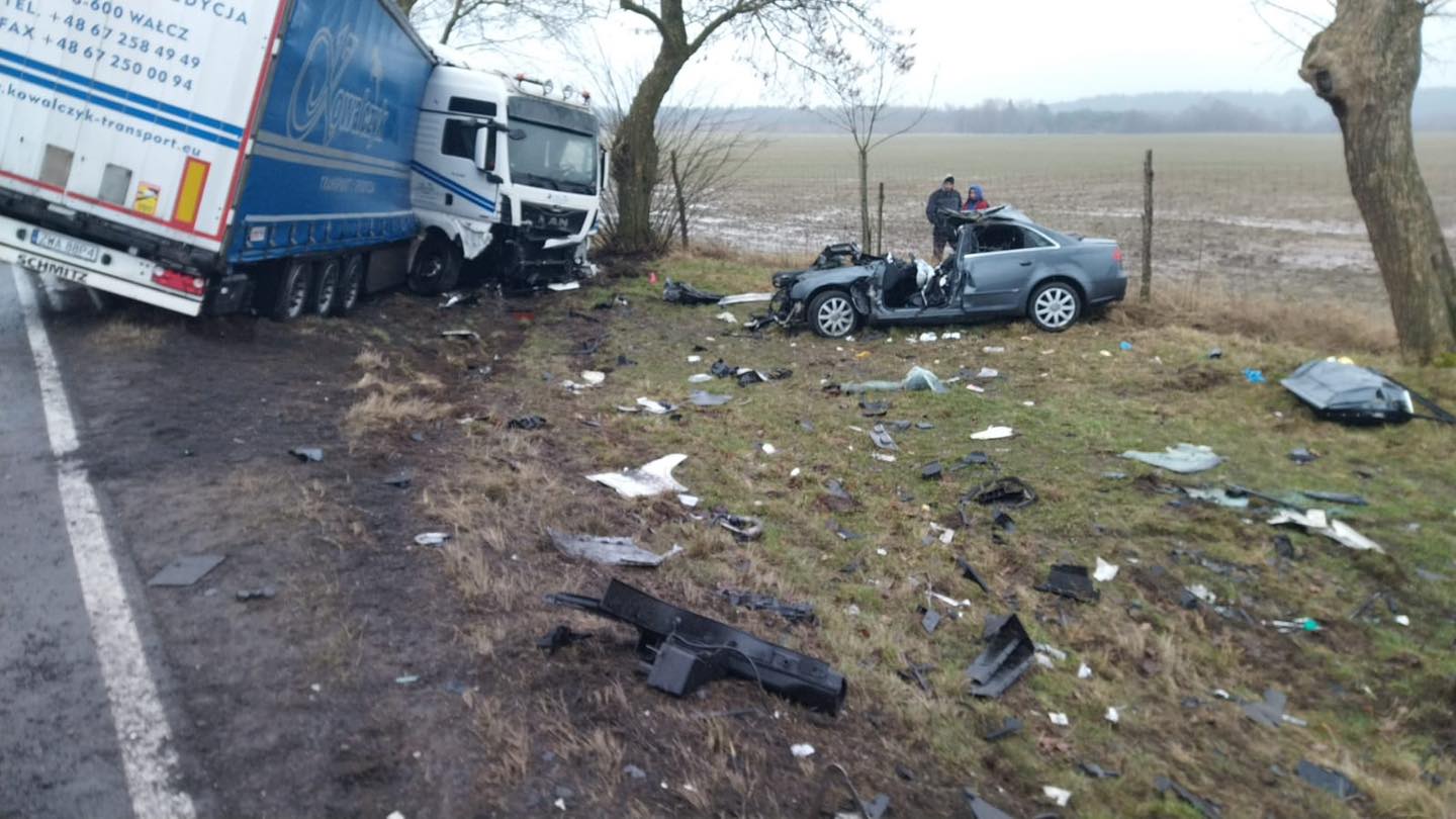 Na wysokości miejscowości Sicko kierujący samochodem osobowym zderzył się z ciągnikiem siodłowym z naczepą. W wyniku zderzenia kierujący osobówką został zakleszczony w zniszczonym pojeździe.