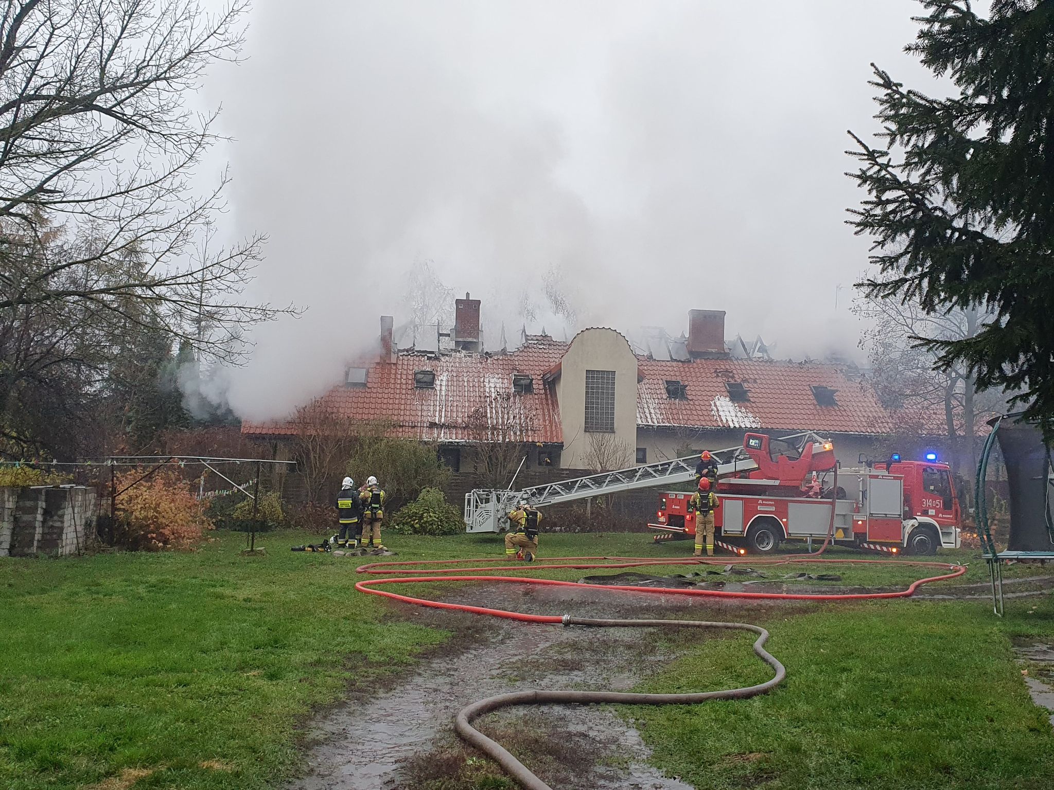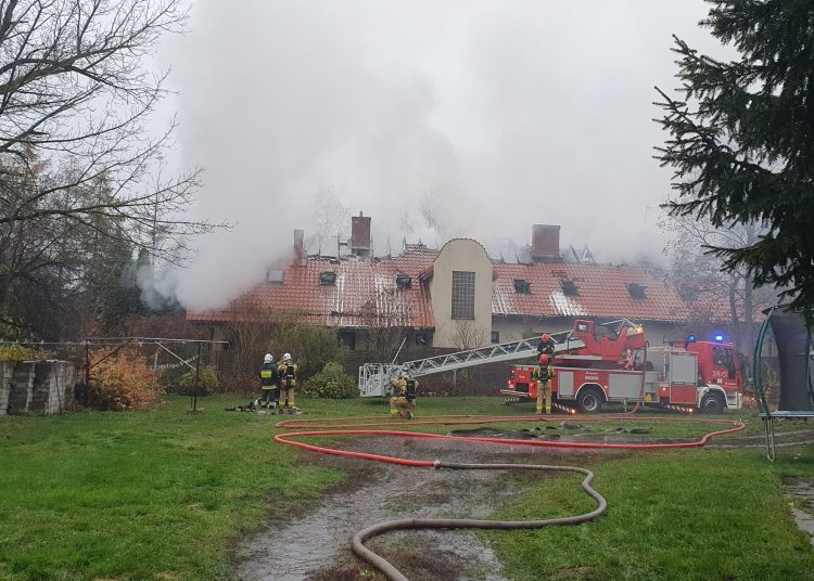 Kilkanaście zastępów straży pożarnej gasi pożar budynku mieszkalnego przy ulicy Pelargonii w dzielnicy Wawer w Warszawie.