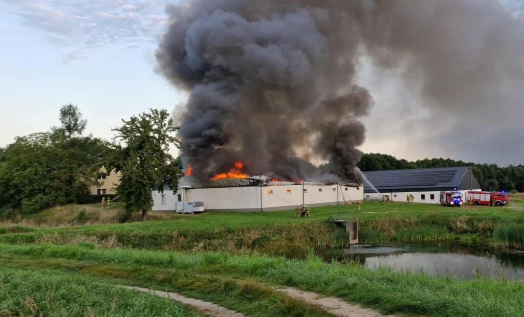 Ogień objął w całości halę o powierzchni około 300 metrów kwadratowych, w środku znajdowały się sieci rybackie, pojemniki i inny sprzęt wykorzystywany przy hodowli ryb. W trakcie działań dach budynku zawalił się do środka.