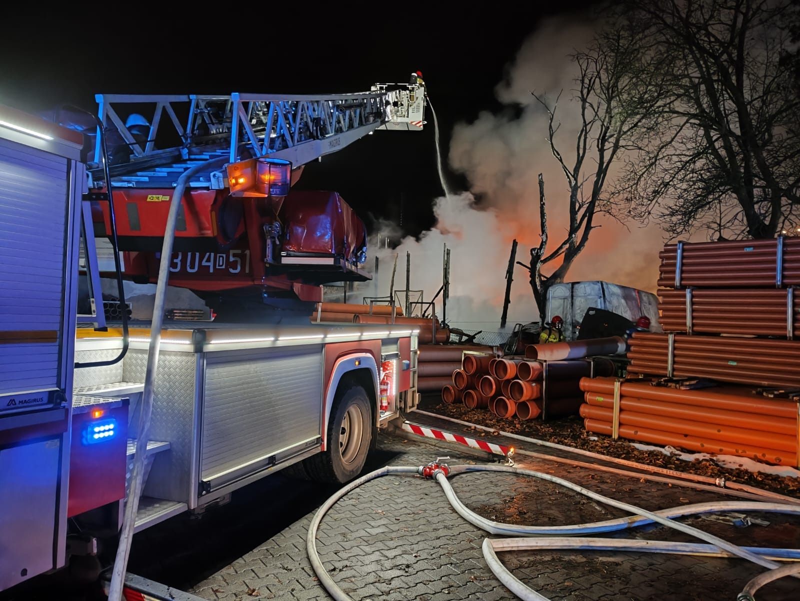 Ogień pojawił się w hali magazynowe w kształcie litery ‘L’, a dokładnie w jej części o wymiarach 20 na 16 metrów. W środku składowane były materiały budowlane. Poza budynkiem paliły się również dwa zaparkowane samochody.