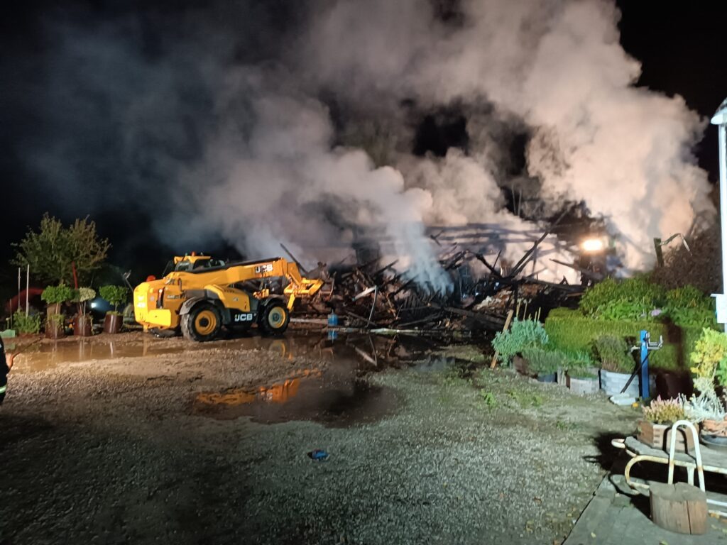 Pożar objął całkowicie jeden budynek wraz ze składowanymi tam materiałami gospodarczymi, nawozami a także garażowanym samochodem pożarniczym – informuje KP PSP w Złotowie.