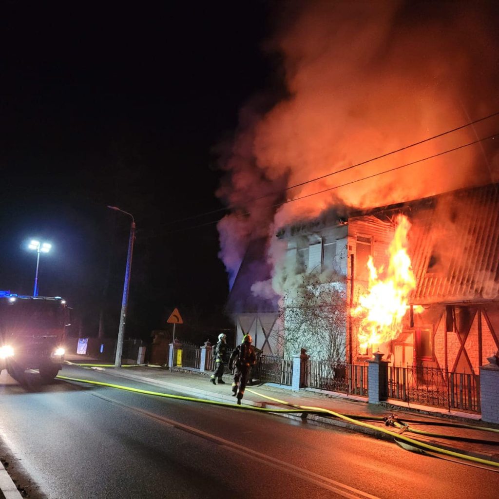 Palił się drewniany dwukondygnacyjny budynek mieszkalny. W środku znajdowało się starsze małżeństwo, które opuściło budynek samodzielnie. Mężczyzna z powodu silnego stresu wymagał pomocy i został przetransportowany do szpitala.