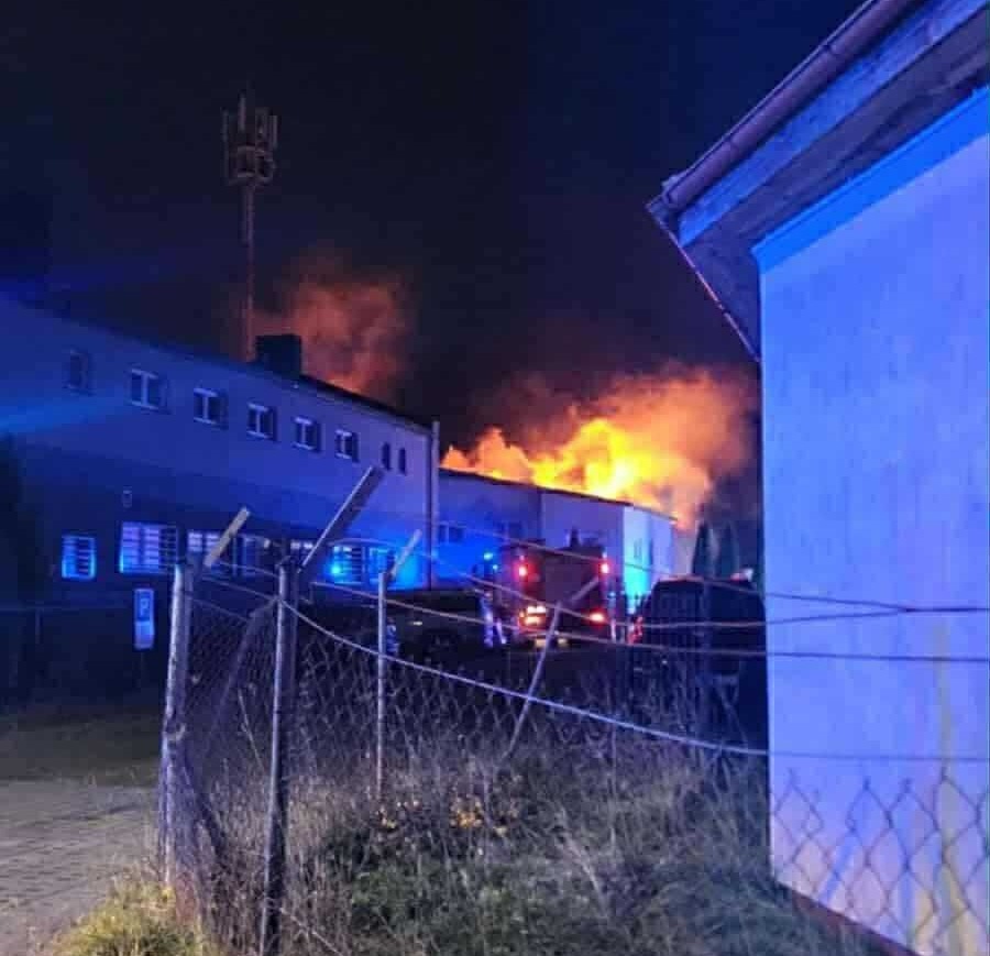 Kilkanaście zastępów straży pożarnej walczy z pożarem hali zakładu meblarskiego w Łężycach na Pomorzu.