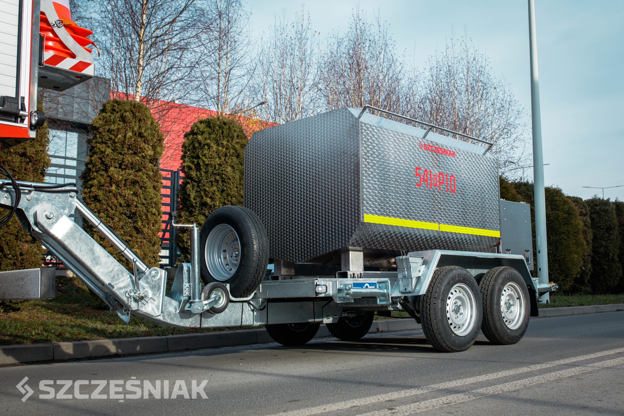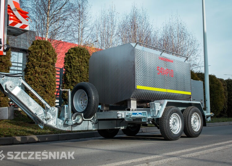 W ostatnim czasie firma SZCZĘŚNIAK Pojazdy Specjalne Sp. z o.o. dostarczyła do kilku wybranych jednostek ratowniczo-gaśniczych Państwowej Straży Pożarnej w Polsce 2-osiowe przyczepy przeznaczone do transportu wody do celów sanitarnych o DMC 3500 kg. Każda z przyczep została wyposażona w dyszel z regulacją wysokości. Pozwala to na jej holowanie przez różne pojazdy. Cała konstrukcja oparta jest na spawanej ramie stalowej zabezpieczonej poprzez cynkowanie ogniowe. Gwarantuje to wysoką odporność na korozję oraz trwałość eksploatacyjną. Dodatkowym elementem zwiększającym bezpieczeństwo użytkowania są ręcznie wysuwane podpory stabilizujące. Umożliwiają one prawidłowe ustawienie przyczepy podczas postoju i jej eksploatacji. Z przodu umieszczono zintegrowany uchwyt koła zapasowego wraz z kołem.