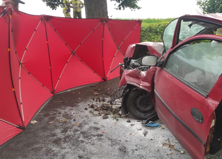 Po godzinie szesnastej kierująca samochodem osobowym opel corsa z nieznanych przyczyn zjechała na przeciwległy pas ruchu i uderzyła w przydrożne drzewo.