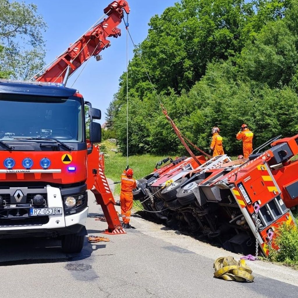 Kierujący strażackim Volvo z 45-metrowym podnośnikiem z nieznanych przyczyn zjechał z drogi do przydrożnego rowu, gdzie pojazd przewrócił się na bok. Kierowcy nic się nie stało. Pojazd przyjechał do Polski do jednego z serwisów.