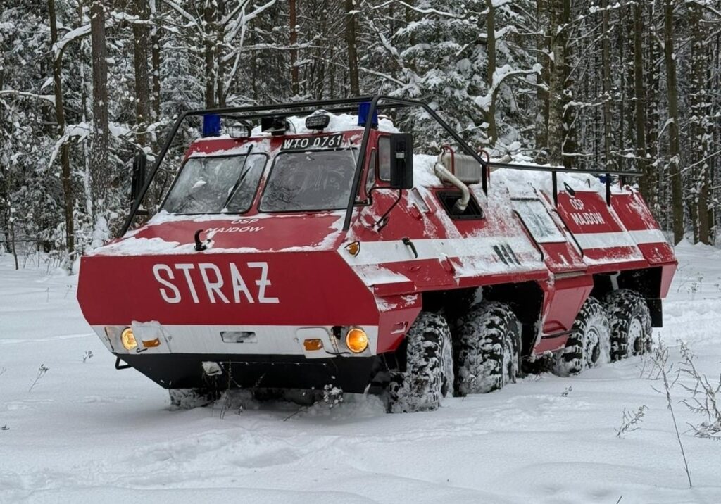 Strażacy z jednostki OSP Majdów zaprezentowali możliwości kołowego transportera SKOT w zimowych warunkach.