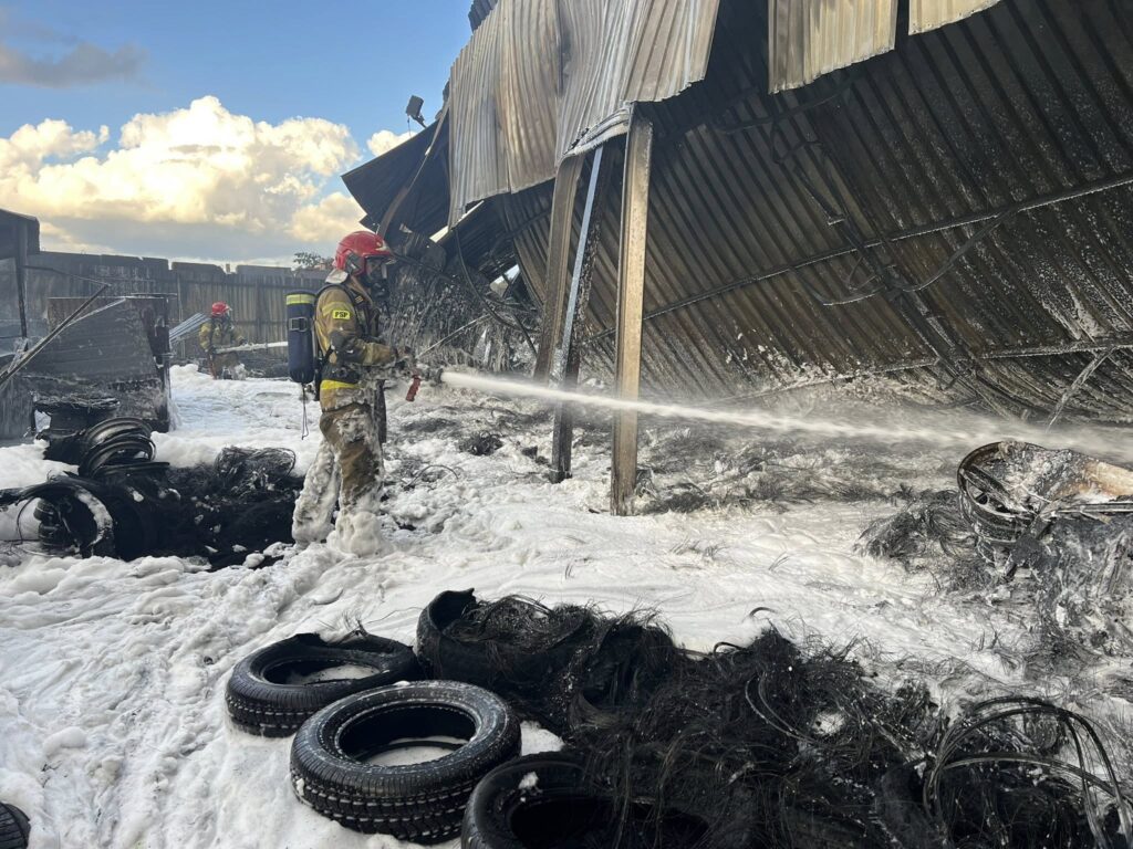 Zgłoszenie o pożarze przy ulicy Pomorskiej straż pożarna otrzymała po godzinie siedemnastej. W zakładzie wulkanizacyjnym paliła się blaszana hala i znajdujące się obok składowisko opon.