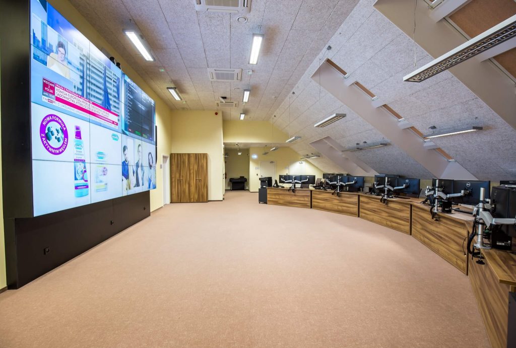 Drugie pomieszczenie to sala dowodzenia. Wyposażona jest m.in. w laserowy projektor, monitory wielkoformatowe i system konferencyjny.
