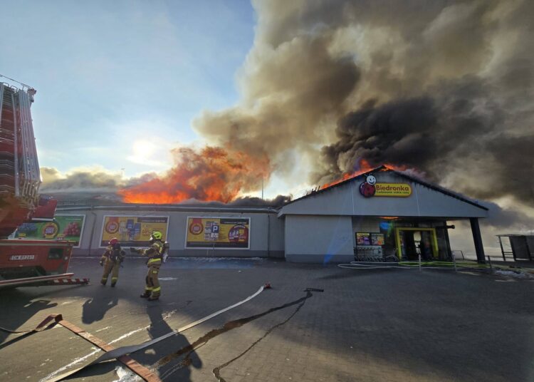 Zgłoszenie o pożarze Biedronki przy ulicy Ogrodowej w Polkowicach straż pożarna otrzymała po godzinie dziesiątej. Na miejscu pracuje około dwadzieścia zastępów.