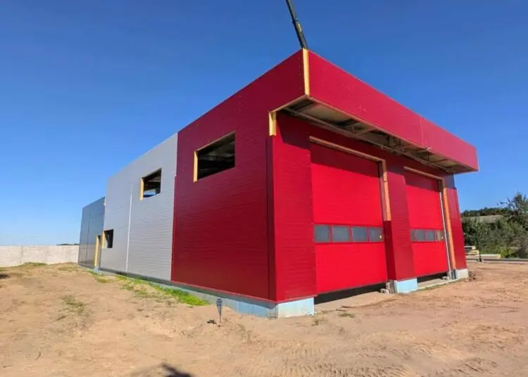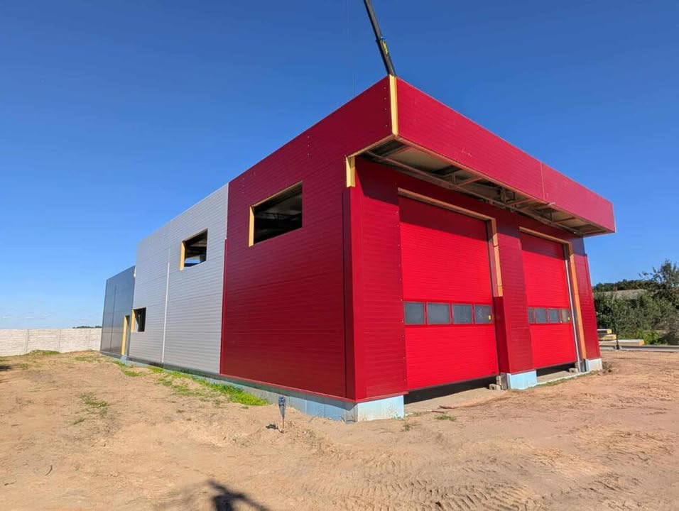 Dlatego zapadła decyzja o budowie nowej i większej remizy, w której znajdą się dwa stanowiska garażowe, magazyn sprzętu, pomieszczenia socjalne, archiwum, toalety i magazyn obrony cywilnej. Budynek w całości powstaje z paneli warstwowych.