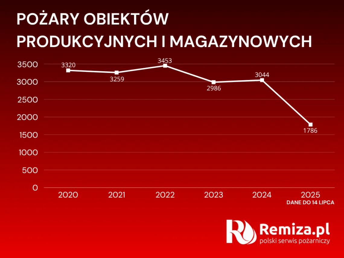 Z pomocą przychodzą dane Państwowej Straży Pożarnej z Systemu Wspomagania Decyzji. I tak, od 1 stycznia 2020 roku do 14 lipca 2025 roku strażacy odnotowali 651 227 różnego rodzaju pożarów, wśród nich 17 893 to pożary obiektów produkcyjnych i magazynowych.