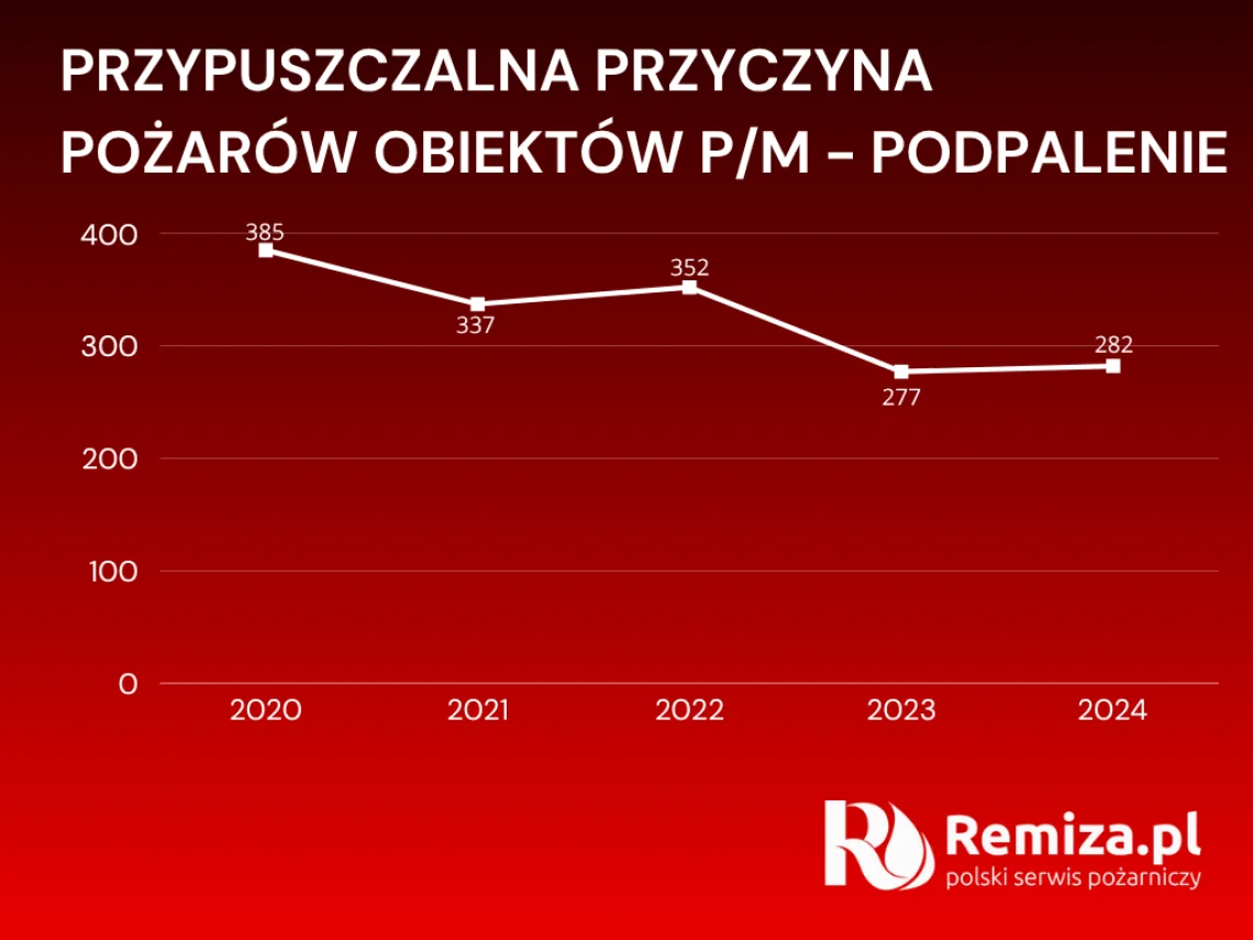 W latach 2020 – 2024 w przypadku 1633 pożarów obiektów produkcyjnych i magazynowych przypuszczalną przyczyną było podpalenie. Najwięcej w roku 2020 – 385.