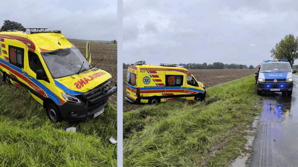 Kierujący ambulansem jadąc w kierunku Oławy stracił panowanie nad pojazdem, zjechał z drogi i dachował. Prawdopodobnie mężczyzna chciał uniknąć zderzenia ze zwierzęciem, które wyszło na drogę, ale czy tak było ustalają policjanci.