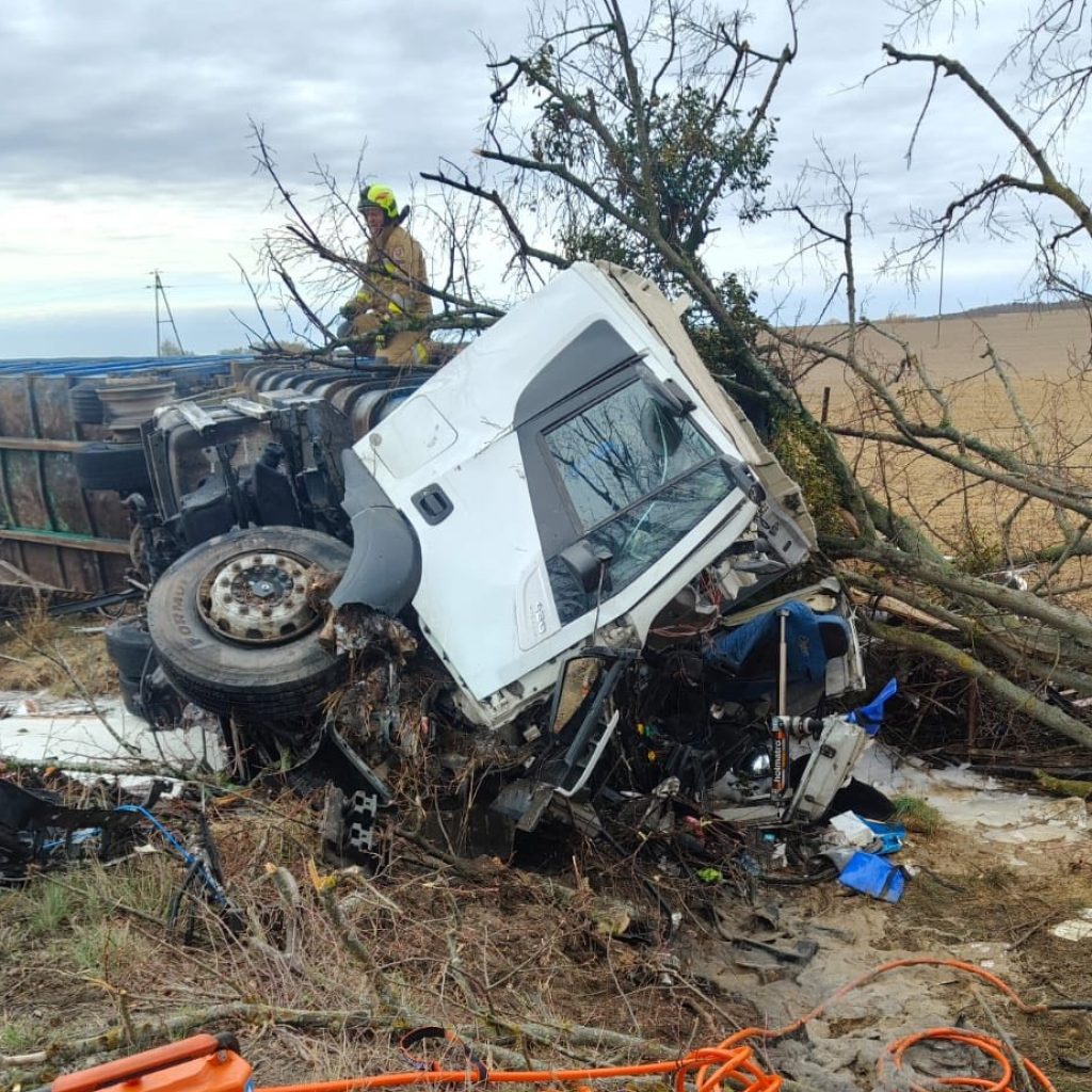 W miejscowości Trąbki Wielkie kierujący ciężarówką zjechał z drogi, uderzył w drzewo. W wyniku uderzenia pojazd stanął w ogniu, a mężczyzna został zakleszczony w zniszczonej kabinie.