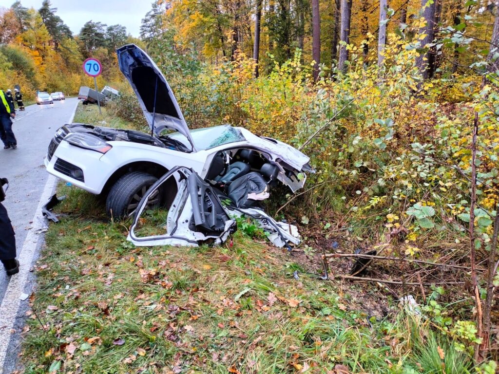 Policjanci wstępnie ustalili, że kierujący samochodem audi zjechał na przeciwległy pas ruchu i doprowadził do zderzenia z jadącym z naprzeciwka busem. W wyniku zderzenia oba pojazdy znalazły się w przydrożnym rowie, audi rozpadło się na dwie części.