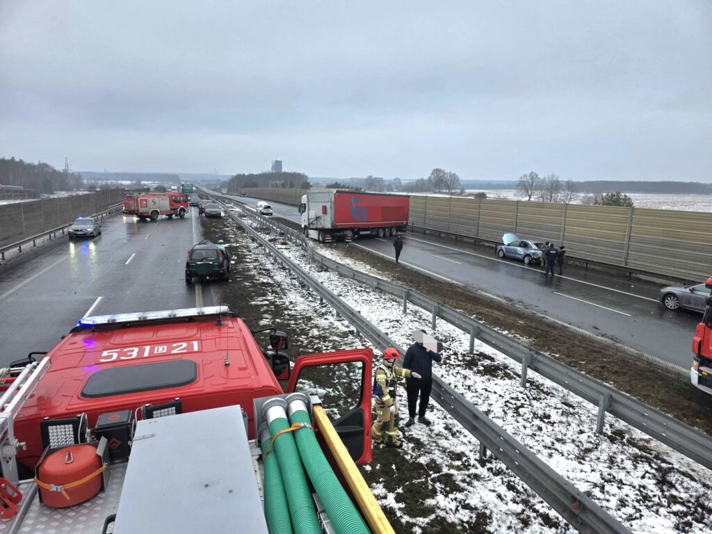 Jeden z kierowców zatrzymał pojazd na pasie zieleni, aby udzielić pomocy osobom poszkodowanym w pierwszym wypadku. W jego samochód uderzył pojazd ciężarowy. Po uderzeniu naczepa samochodu ciężarowego zablokowała dwa pasy ruchu – informuje mł. kpt. Adrian Ziemiański, Oficer Prasowy Komendanta Powiatowego PSP w Polkowicach. W sumie w zdarzeniu brało udział sześć pojazdów.