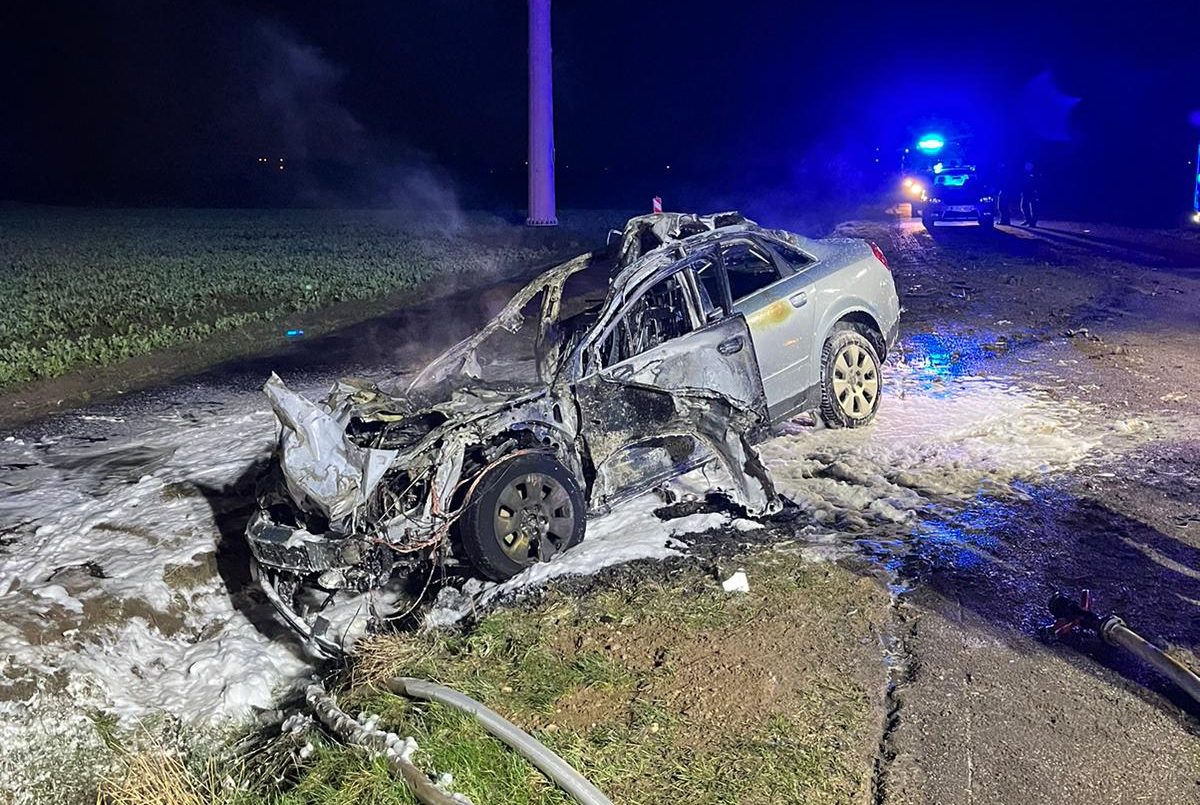 Po godzinie pierwszej w nocy kierujący samochodem osobowym uderzył w tył ciągnika rolniczego. W wyniku zderzenia osobówka stanęła w płomieniach.