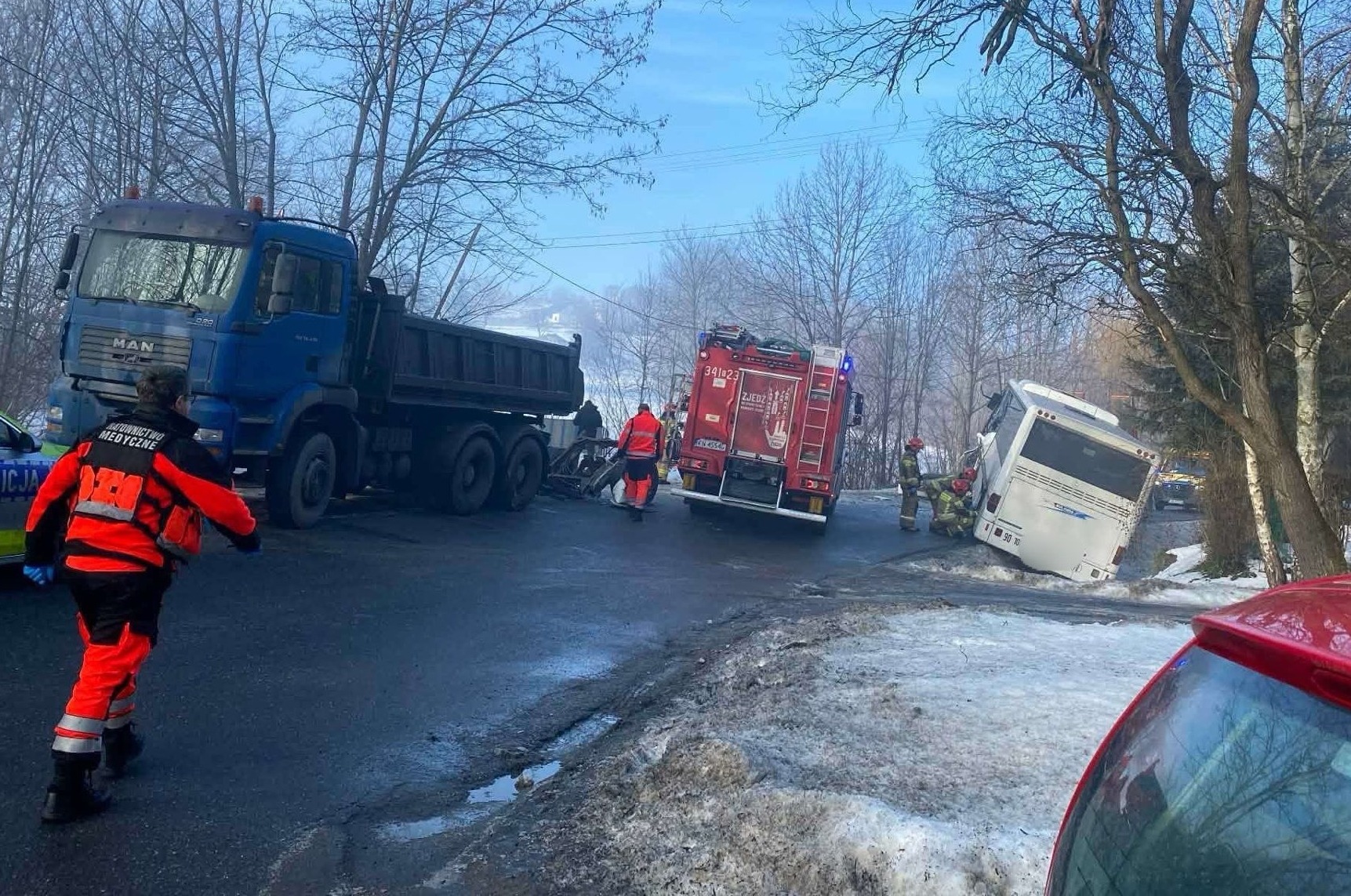 Do szpitala trafił kierowca autokaru, który wcześniej został ewakuowany przez strażaków przy pomocy narzędzi hydraulicznych.