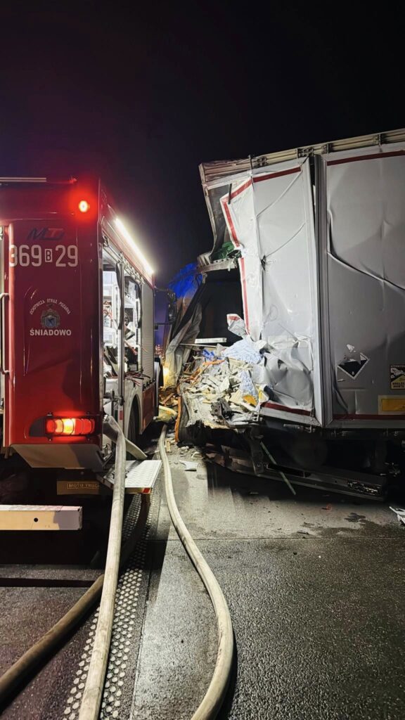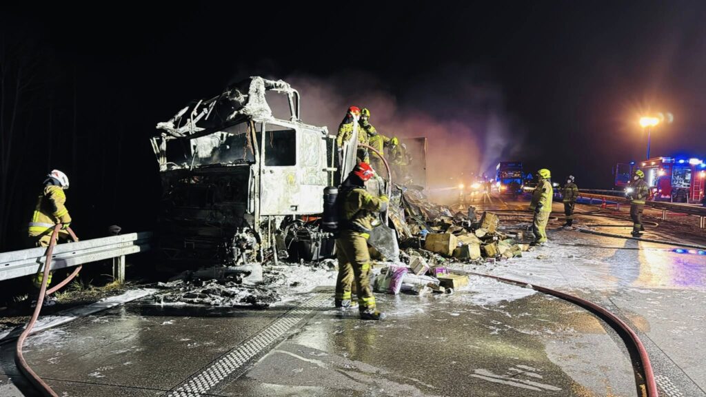 Ze wstępnych ustaleń wynika, że kierujący ciągnikiem siodłowym z naczepą uderzył w tył ciężarówkę stojącą na pasie awaryjnym. W wyniku zderzenia wybuchł pożar, który szybko objął ciągnik siodłowy i naczepę, w której znajdowała się karma dla zwierząt. Zestaw spłonął całkowicie.