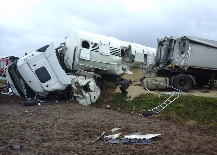 W pobliżu miejscowości Puchały Stare z nieznanych przyczyn zderzyły się dwie ciężarówki. W wyniku zderzenia jeden z zestawów przewrócił się na bok i przygniótł kabinie drugiego zestawu, w której został zakleszczony kierowca.